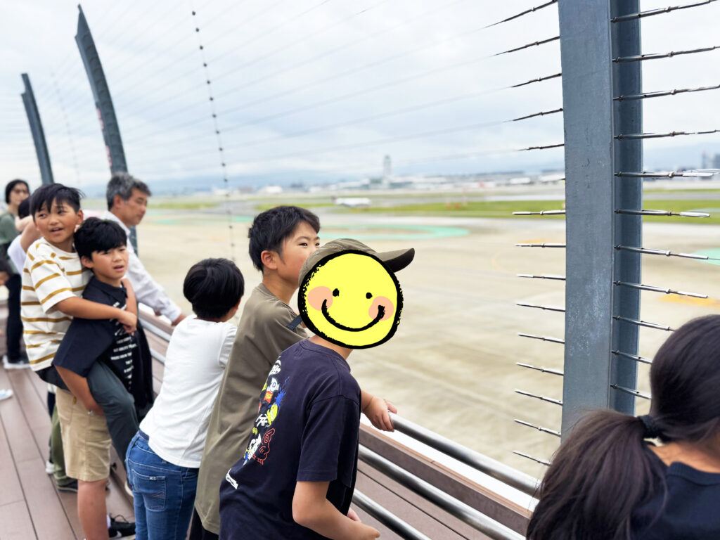 離着陸する飛行機を見ながら、「あの飛行機速い!」「羽が動いた!」と大盛り上がり。