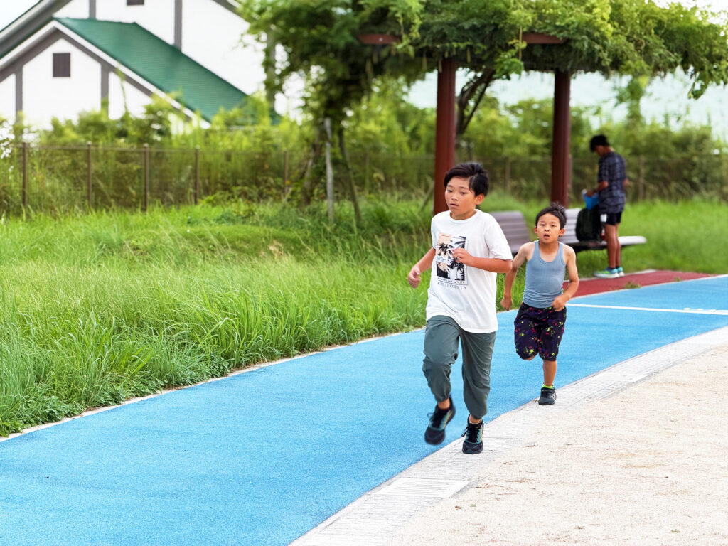 まずはしっかりと準備運動をして体をほぐしたあと、1km走と50m走に挑戦!