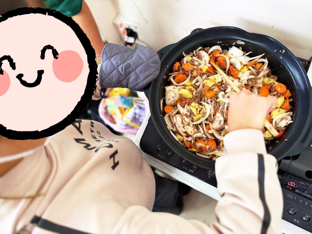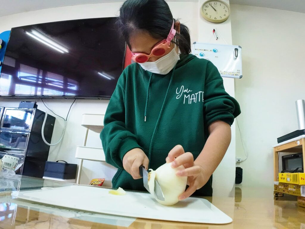 ちなみに、玉ねぎを切るのが苦手な女の子は、前回涙が止まらなくなったトラウマから、この日はゴーグル装備で挑戦していました🤣