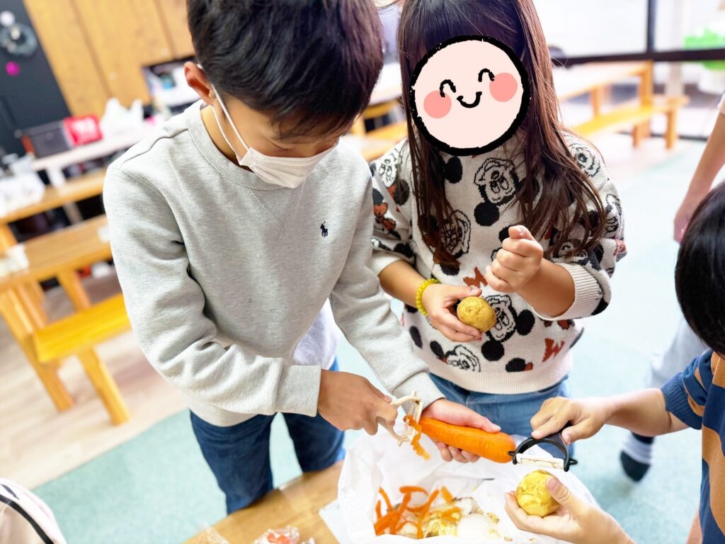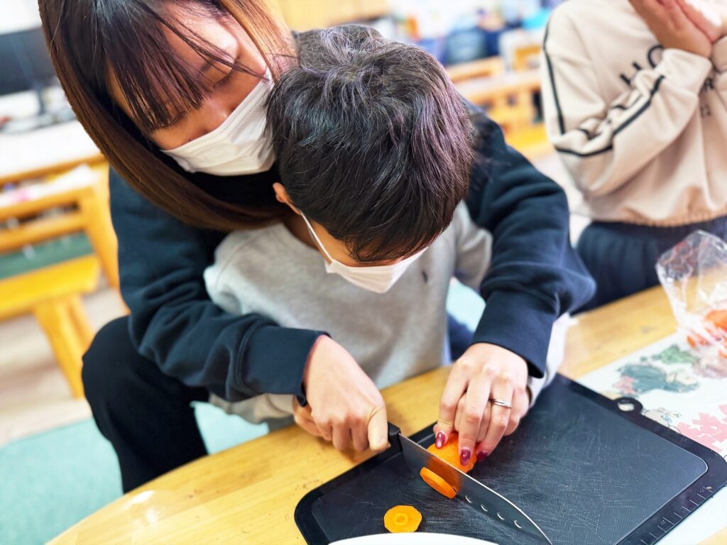まだ包丁に慣れていない子は、先生と一緒に人参を切ってチャレンジ✨