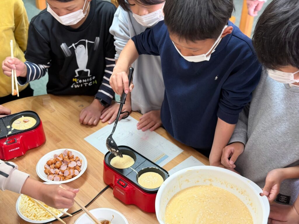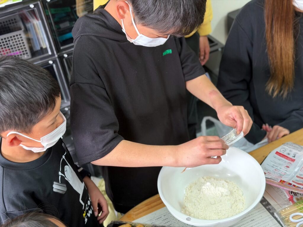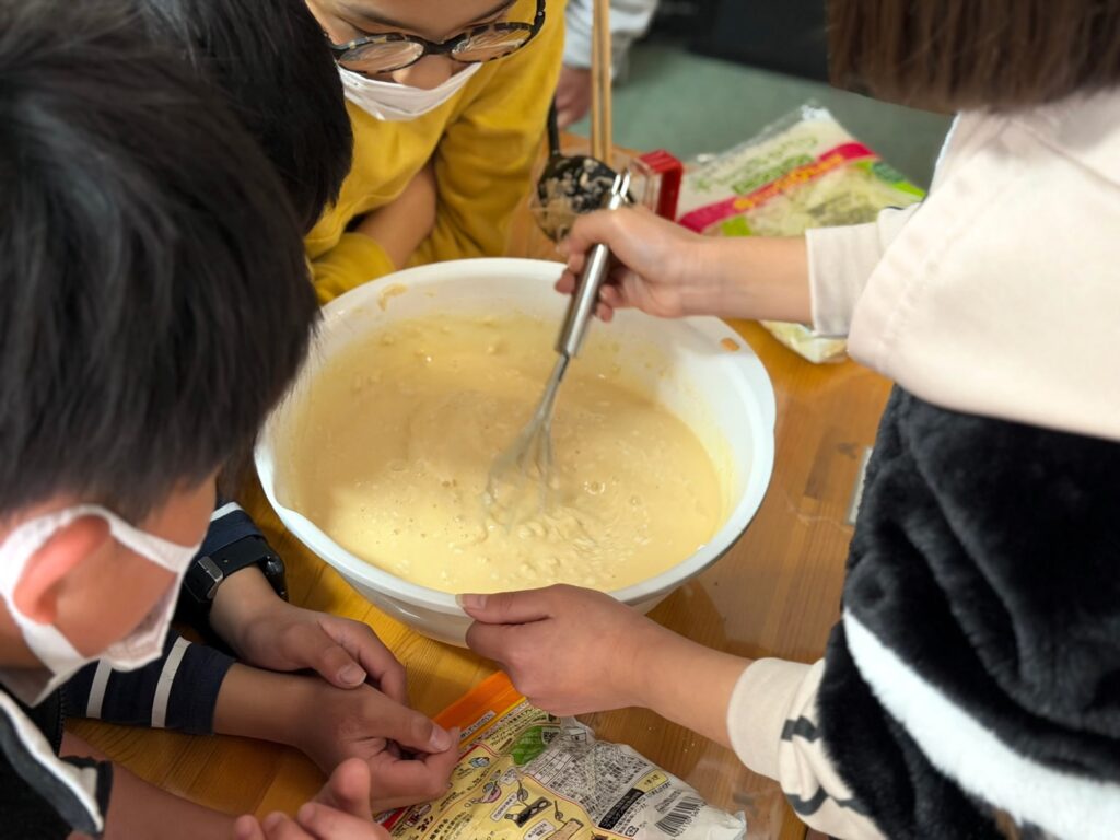 今回は工程ごとに役割を分担し、粉を入れる子・卵を割る子・材料を混ぜる子など、それぞれが自分の担当をしっかり頑張ってくれました👏