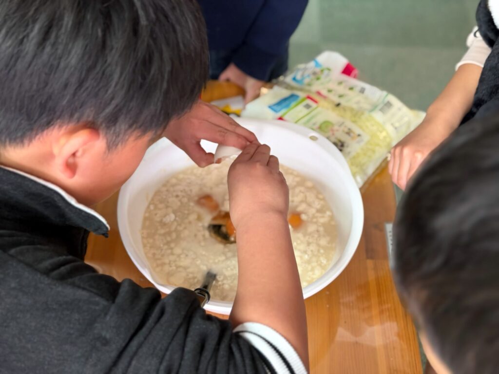 「次はこれ入れる?」「いい感じになってきた!」と声を掛け合いながら、みんなで協力して生地を作っていきます。